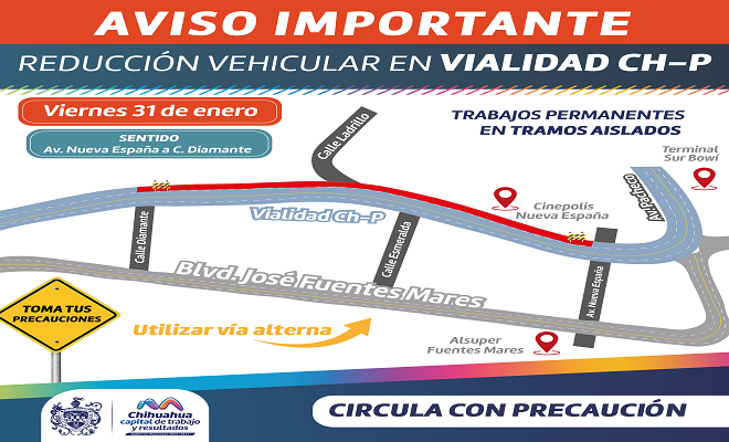 Ciudad de Chihuahua.- La Dirección de Obras Públicas municipales, informa que a partir del viernes 31 de enero se reducirá la circulación vehicular en vialidad CH-P, en tramos aislados desde la avenida Nueva España a calle Diamante, por el inicio de reposición de losas de concreto, por lo que se exhorta a conducir con precaución por las zonas de trabajo.