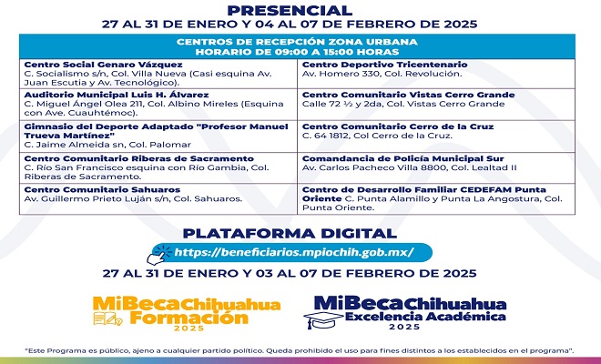 Ciudad de Chihuahua.- La Dirección de Desarrollo Humano y Educación, invita a la ciudadanía a conocer y registrarse en los programas “Mi Beca Chihuahua Excelencia Académica” y “Mi Beca Chihuahua Formación” 2025.