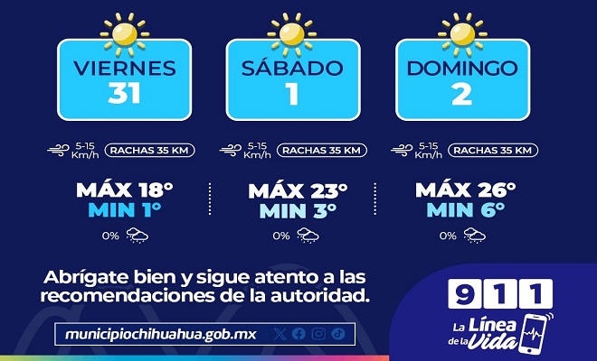 Ciudad de Chihuahua.- La Coordinación Municipal de Protección Civil, informa que este fin de semana, del 31 de enero al 2 de febrero, se prevén temperaturas cálidas por la tarde, con máximas de 26°C y mínimas de 1°C.