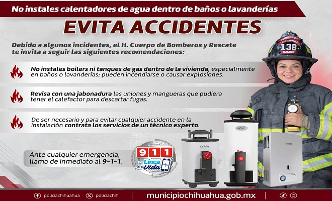 Ciudad de Chihuahua.- Para evitar accidentes por intoxicaciones por gas, el Heroico Cuerpo de Bomberos y Rescate, exhorta a la comunidad a no instalar boilers o tanques dentro de baños, lavanderías o pasillos en los domicilios.