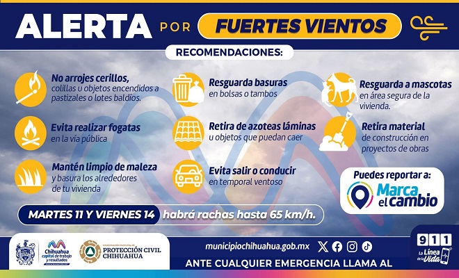 Ciudad de Chihuahua.- La Coordinación Municipal de Protección Civil, emite recomendaciones por los fuertes vientos que se pronostican para esta semana, especialmente para el martes 11 y viernes 14 de febrero, donde se prevén rachas de vientos de hasta 65 kilómetros por hora.