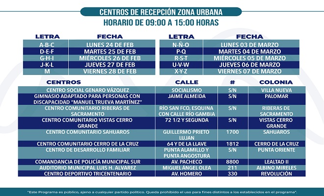 En la zona urbana la recepción de documentos se realizará del 24 de febrero al 07 de marzo del 2025, en un horario de las 9:00 a 15:00 horas, bajo el siguiente orden alfabético por apellido de la persona solicitante.