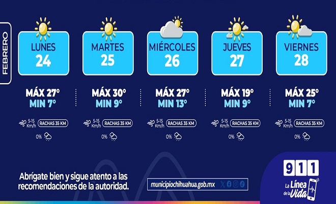 Ciudad de Chihuahua.- La Coordinación de Protección Civil Municipal informa que para esta semana se pronostican temperaturas máximas de 30°C para mañana martes, sin embargo el jueves solo alcanzará los 19°C.