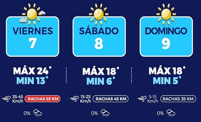 Finalmente, el domingo se espera una máxima de 18°C y una mínima de 5°C y cielo mayormente soleado.
