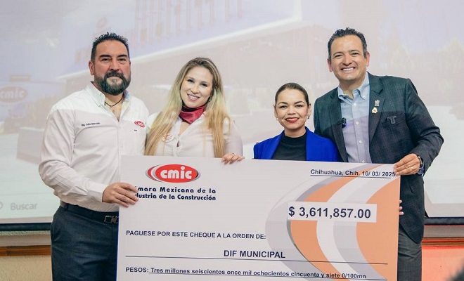 Ciudad de Chihuahua.- El alcalde Marco Antonio Bonilla Mendoza y la presidenta del DIF Municipal Karina Olivas, recibieron de parte de la Cámara Mexicana de la Industria de la Construcción (CMIC) delegación Chihuahua, un cheque por la cantidad de 3 millones 611 mil 857 pesos, como aportación del gremio para la construcción de la Casa Hogar que construye el Gobierno Municipal.