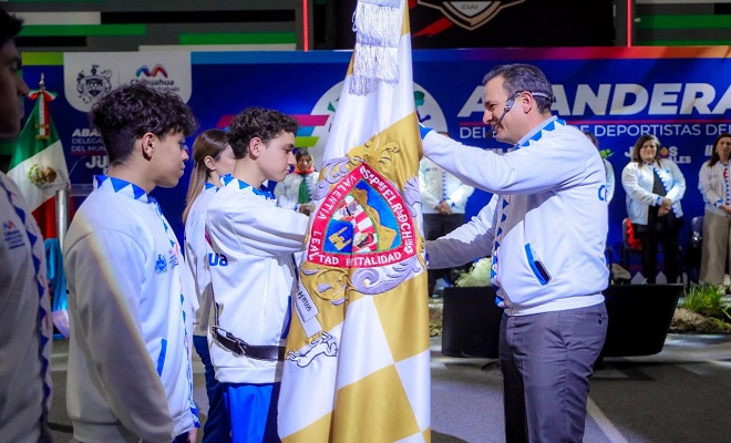 Ciudad de Chihuahua.- El alcalde Marco Bonilla, abanderó a deportistas y entrenadores que integran la delegación del Municipio para su participación en las diversas disciplinas del calendario de los Juegos Estatales CONADE 2025, participan más de mil 200 deportistas y entrenadores que tendrán competencia en 35 diferentes disciplinas deportivas.