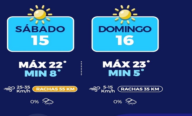 Para el día sábado, se pronostica la elevación de la temperatura a 22°C, y una mínima de 8°C, con cielo soleado, con la presencia de ráfagas de viento de hasta 55 kilómetros por hora.