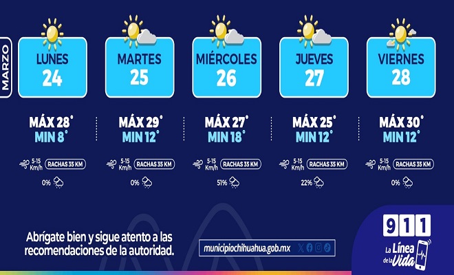 Ciudad de Chihuahua.- La Coordinación de Protección Civil Municipal informa que para esta semana se pronostican temperaturas máximas de 30°C con mínimas de 8°C, así como un 51 por ciento de probabilidad de lluvia para el miércoles 26 de marzo.