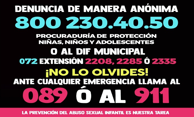 Ciudad de Chihuahua.– El DIF Municipal reitera a la ciudadanía que pueden generar una denuncia anónima al 089, al 800-230-40-50, (Procuraduría de Protección a Niñas, Niños y Adolescentes) o bien al 9-1-1, si se trata de emergencias, ante la sospecha o conocimiento de casos de abuso infantil de cualquier tipo.