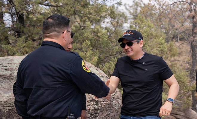 Ciudad de Chihuahua.- El alcalde Marco Antonio Bonilla Mendoza, realizó pase de revista y supervisó el operativo por Semana Santa que se efectúa por parte de la Dirección de Seguridad Pública Municipal (DSPM) en el Parque Nacional Cumbres de Majalca, uno de los lugares turísticos más concurridos en estas fechas.