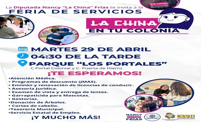 Ciudad de Chihuahua.- La Diputada Nancy Frías invita a todos los vecinos y vecinas del Distrito 12 a participar en la Feria de Servicios, que se celebrará este martes 29 de abril a partir de las 4:30 p. m. en el Parque «Los Portales».