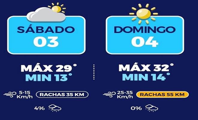 Para el día sábado, se pronostica la elevación de la temperatura a 29°C, y una mínima de 13°C, con cielo mayormente nublado. Para este día se prevé un 4% de probabilidad de lluvia y finalmente, el domingo se espera una máxima de 32°C y una mínima de 14°C y cielo soleado con rachas de viento de hasta 55 kilómetros por hora.