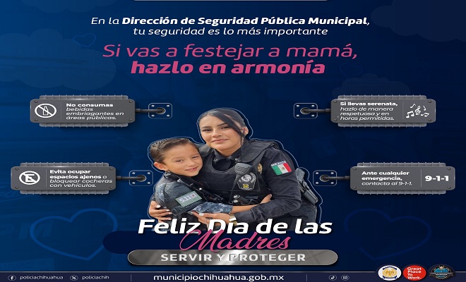 Ciudad de Chihuahua.-La Dirección de Seguridad Pública municipal, emite recomendaciones para conducirse con civilidad y evitar multas y/o arrestos a quienes llevarán serenata como parte del 10 de mayo, Día de las Madres, fecha donde agentes realizarán recorridos especiales por la ciudad para prevenir la comisión de faltas o delitos.