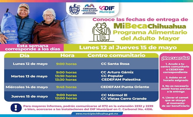 Ciudad de Chihuahua.- El DIF Municipal informa a las y los solicitantes del Programa Alimentario del Adulto Mayor (PAAM) los centros comunitarios y horarios en los que podrán acudir por su paquete alimentario del 12 al 15 de mayo.