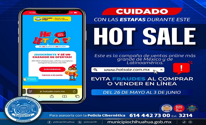 Ciudad de Chihuahua.- En vísperas de que dé inicio el llamado “Hot Sale”, campaña de ventas en México y Latinoamérica, la Policía Cibernética municipal, emite recomendaciones para evitar que las y los consumidores caigan en redes de estafadores que buscan obtener recursos de manera fácil e ilícita.