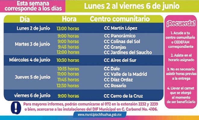 Ciudad de Chihuahua.- El DIF municipal informa a solicitantes del Programa Alimentario del Adulto Mayor (PAAM) los centros comunitarios y horarios en los que podrán acudir por su paquete alimentario del 02 al 06 de junio.
