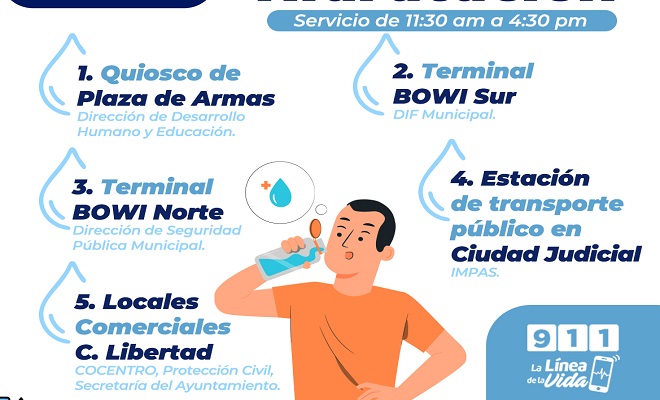 Ciudad de Chihuahua.- La Coordinación Municipal de Protección Civil, diversos puntos de hidratación en la ciudad, que buscan auxiliar a la población ante posibles casos de golpes de calor y evitar afecciones a la salud de los chihuahuenses.