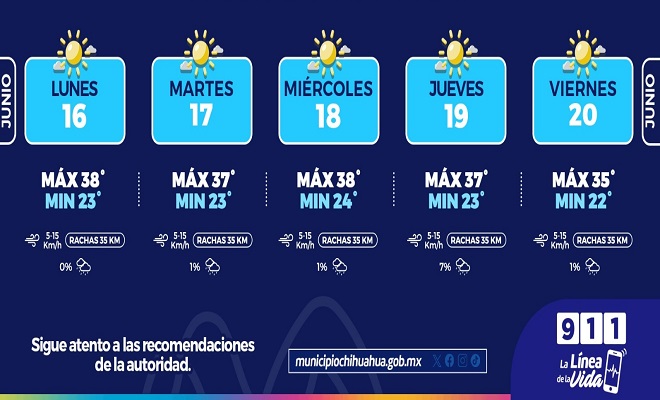 Ciudad de Chihuahua.- La Coordinación Municipal de Protección Civil exhorta a tomar precauciones por las altas temperaturas que se esperan para esta semana en la ciudad, ya que se prevén máximas de hasta 38°C.