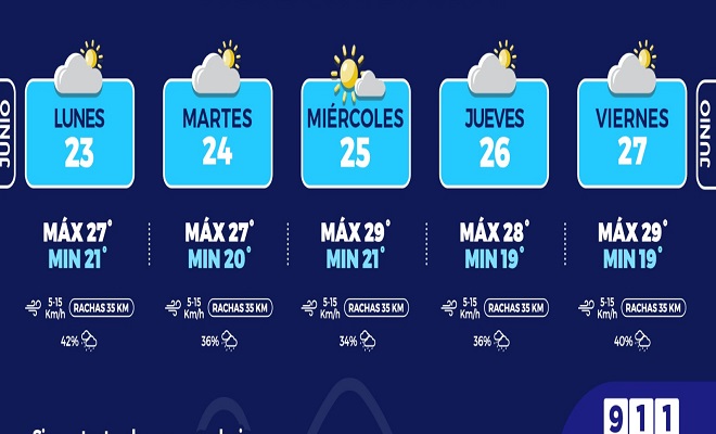 Para el miércoles 25, se pronostica un cielo parcialmente nublado, con temperaturas entre 21 y 29°C, probabilidad del 34 por ciento de lluvias vespertinas, también con tormentas eléctricas previstas.