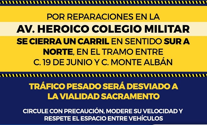 Ciudad de Chihuahua.- La Dirección de Obras Públicas municipales, anuncia el cierre de un carril en sentido sur a norte, en el tramo entre las calles 19 de junio y Monte Albán de la avenida Heroico Colegio Militar por reparaciones.