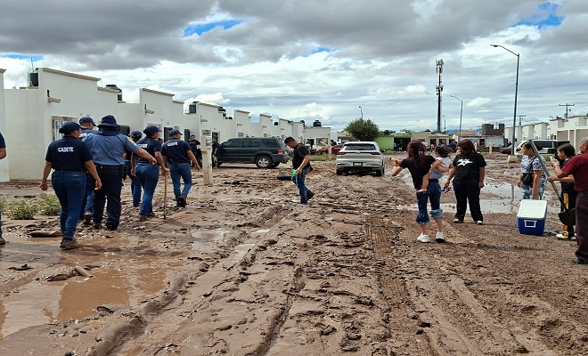 Ciudad de Chihuahua.- Cadetes de la academia de la Policía Municipal y de Bomberos, se unieron al trabajo que realiza el Gobierno Municipal en las zonas que sufrieron inundaciones, con limpieza dentro y fuera de sus hogares, para retirar el lodo que arrastró la corriente.