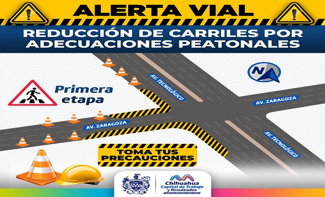 H. Ciudad de Chihuahua.-La Dirección de Obras Públicas municipales, emite una alerta vial por la reducción de carriles en la intersección de las avenidas Zaragoza y Tecnológico por el inicio de adecuaciones peatonales que realizarán en dicho crucero.