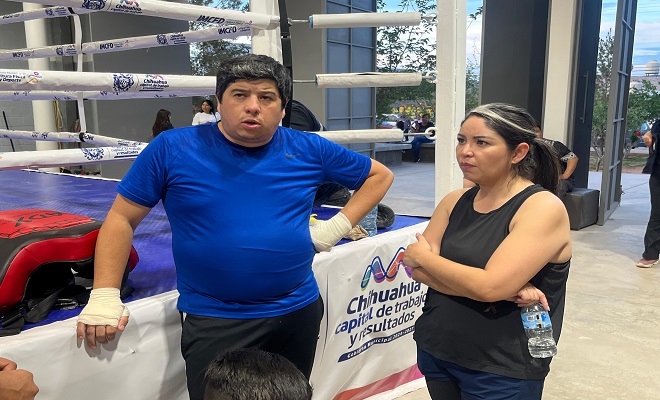 Ciudad de Chihuahua.- Como parte de la gira “En los Zapatos del Deporte”, el regidor presidente de la Comisión de Deporte del Ayuntamiento, Adán Galicia, visitó el nuevo gimnasio de box Santa Cecilia, acompañado por la diputada local del Distrito 12, Nancy “La China” Frías, quien se sumó de manera activa a este movimiento que busca visibilizar y fortalecer el trabajo deportivo.