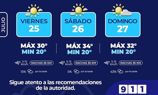 Ciudad de Chihuahua.- La Coordinación Municipal de Protección Civil de Chihuahua informa que, para este fin de semana del 25 al 27 de julio, se esperan temperaturas cálidas con una mayor probabilidad de lluvias para el domingo.