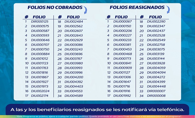 A los beneficiarios reasignados se les notificará vía telefónica. En total, se otorgaron apoyos a 4 mil 240 personas, de las cuales 4 mil 121 pertenecen a zonas urbanas y 119 a zonas rurales. Cada beneficiario recibe un monto individual de 4 mil pesos, lo que representa una inversión total de 16 millones 960 mil pesos.