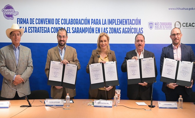 Chihuahua.- La gobernadora Maru Campos firmó un convenio de colaboración con el Consejo Estatal Agropecuario (CEACH), por medio del cual se integrarán a la campaña de vacunación que el Gobierno del Estado implementa en toda la entidad.