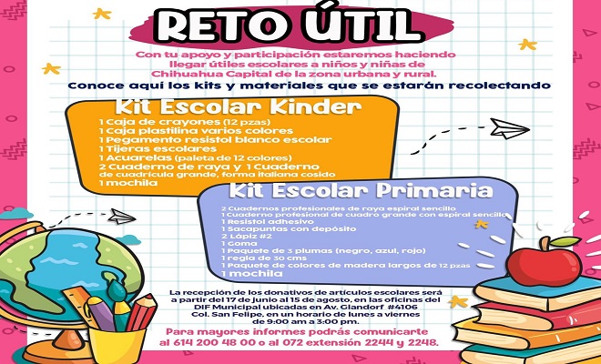 Ciudad de Chihuahua.- Última semana para participar en el programa “Reto Útil”, impulsado por el DIF Municipal, que busca reunir mochilas con útiles escolares para niñas y niños de preescolar y primaria en situación de vulnerabilidad, tanto en la ciudad como en la zona rural.