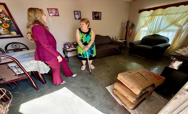 Chihuahua.- La diputada local del Partido Acción Nacional (PAN), Carla Rivas, realizó un recorrido matutino por la colonia Cumbres del Sur, donde hizo entrega de sacos de cemento a vecinas del sector, en atención a solicitudes presentada semanas atrás.