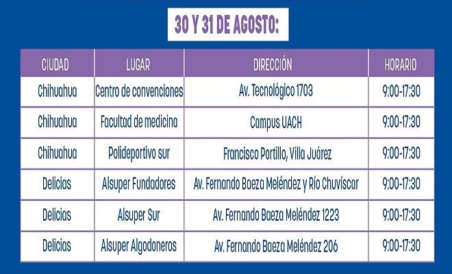 En Nuevo Casas Grandes el 30 de agosto en la Plaza Deportiva, en un horario de 8:00 a 14:00 horas y en la Plaza Deportiva Nogales de 16:00 a 20:00 horas; el 31 de agosto será en la Plaza de la colonia Villahermosa, de 8:00 a 14:00 horas y de 16:00 a 20:00 horas.