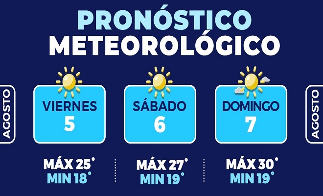 El domingo para cerrar el fin de semana se espera un día parcialmente nublado, con temperaturas que alcanzarán los 30°C de máxima y 19°C de mínima, la probabilidad de lluvia será menor, del 15 por ciento por la tarde.