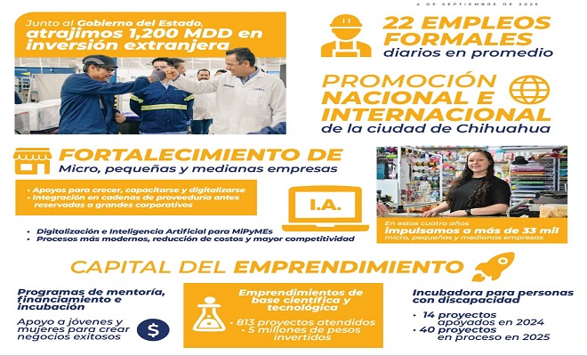 Gracias a esta estrategia integral, en promedio se generan 22 empleos formales cada día, consolidando a Chihuahua como un motor económico del norte del país. Este logro es resultado de las campañas nacionales e internacionales de promoción de la ciudad, que destacan su competitividad, mano de obra calificada e infraestructura moderna.