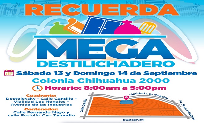 Ciudad de Chihuahua.- La Dirección de Servicios Públicos Municipales, invita a la ciudadanía y vecinos de la colonia Chihuahua 2000 a hacer uso del Mega Destilichadero mismo que permanecerá este sábado 13 y domingo 14 de septiembre en un horario de 8:00 am a 5:00 pm.