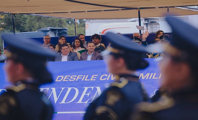 Ciudad de Chihuahua.- El alcalde Marco Antonio Bonilla Mendoza, asistió al desfile por el 215 aniversario de la Independencia de México, donde acompañó a la gobernadora María Eugenia Campos Galván a este festejo del 16 de septiembre, para rememorar el inicio de la batalla por la libertad del país con un contingente lleno de corporaciones de seguridad de todos los niveles gubernamentales.