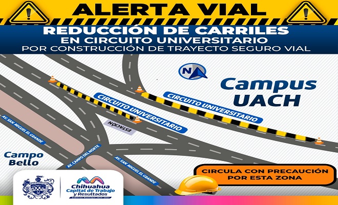 Ciudad de Chihuahua.- La Dirección de Obras Públicas, emite una alerta vial por la reducción de carriles en el Circuito Universitario a la altura de la Facultad de Ingeniera de la UACH, en el sentido sur-norte debido a los trabajos de demolición de asfalto para la construcción de un paso peatonal pompeyano, como parte de la obra denominada Trayecto Vial Seguro.