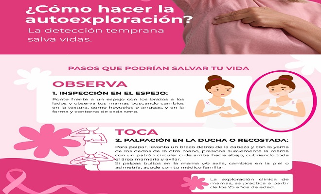 Ciudad de Chihuahua.- En el marco del Mes de Sensibilización sobre el Cáncer de Mama, el Instituto Municipal de Pensiones, recomienda a las mujeres realizar autoexploración mensual que ayuda a familiarizarse con las mamas y a detectar cualquier signo de enfermedad a tiempo.