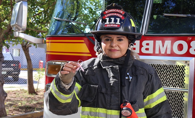 Sandra Durán , cuenta con 14 años de antigüedad en el H. Cuerpo de Bomberos de Chihuahua y actualmente tiene el grado de bombero segundo, se define como una guerrera, una luchadora que sobrevivió al cáncer de mama y la transformó en una persona fuerte, más cuando recuerda la frase que le han repetido: “si pudiste con eso puedes con todo.”
