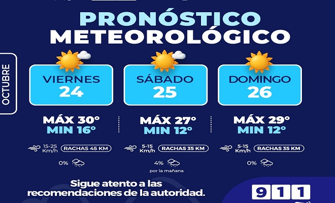 Con base en la información emitida por el Servicio Meteorológico Nacional (SMN), para este viernes 24 de octubre, se prevé un cielo mayormente soleado, con una temperatura máxima de 30°C y mínima de 16°C. Se presentará viento de 15 a 25 kilómetros por hora, con rachas que podrían alcanzar hasta 45 kilómetros por hora, sin probabilidad de lluvia.