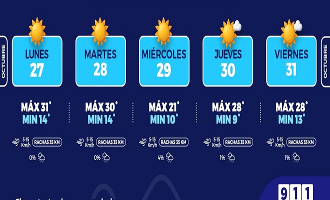 El jueves 30 de octubre se mantendrá mayormente soleado, con una temperatura máxima de 28°C y mínima de 9°C, por lo que se anticipa una mañana fría y finalmente, para el viernes 31 de octubre, se espera un día mayormente soleado, con máxima de 28°C y mínima de 13°C, con rachas de viento de 35 kilómetros por hora, y una probabilidad mínima de lluvia del 1 por ciento.