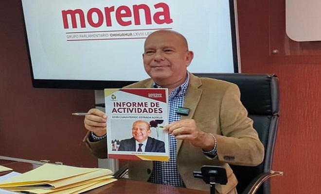 Chihuahua.- El diputado Cuauhtémoc Estrada Sotelo, coordinador del Grupo Parlamentario de morena y representante del Distrito 08 de Ciudad Juárez en la Sexagésima Octava Legislatura del Congreso del Estado de Chihuahua, presentó su primer informe de trabajo legislativo, en el que destacó un año de resultados, diálogo constante con la ciudadanía y compromiso firme con los principios de la Cuarta.