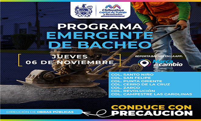 Ciudad de Chihuahua.-La Dirección de Obras Públicas Municipales, llevan a cabo este viernes 7 de noviembre operativo de bacheo emergente en seis zonas de la capital.