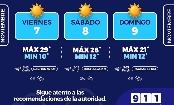 Ciudad de Chihuahua.- La Coordinación Municipal de Protección Civil, informa que para este fin de semana se pronostican condiciones mayormente soleadas y un ligero descenso en la temperatura.
