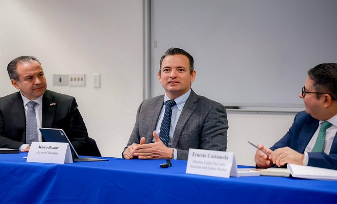 Durante su intervención, Marco Bonilla compartió con los estudiantes la experiencia de Chihuahua Capital en crecimiento económico, seguridad y participación ciudadana. Destacó la importancia de que municipios y universidades trabajen juntos para desarrollar soluciones innovadoras que respondan a las demandas actuales de las comunidades.