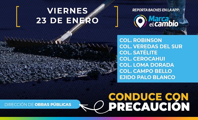 Ciudad de Chihuahua.- La Dirección de Obras Públicas municipales, realizará trabajos de bacheo este viernes 23 de enero mediante el programa emergente en calles de las colonias: Robinson, Veredas del Sur, Satélite, Cerocahui, Loma Dorada y Campo Bello, así como en el Ejido Palo Blanco.