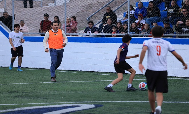 Ciudad de Chihuahua.- El alcalde Marco Antonio Bonilla Mendoza, inauguró la rehabilitación del parque Lomas Karike, donde convivió con vecinos y jugó un partido de futbol con menores del sector, como parte de la entrega de este espacio público renovado gracias al Presupuesto Participativo.