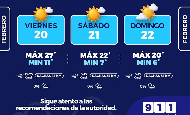 Asimismo, para este sábado se pronostica una máxima de 22°C y mínima de 7°C, con condiciones también mayormente soleadas; y para el domingo se anticipa una temperatura máxima de 20°C y mínima de 6°C, con cielo parcialmente nublado. Para ambos días se esperan rachas de viento de hasta 35 kilómetros por hora.