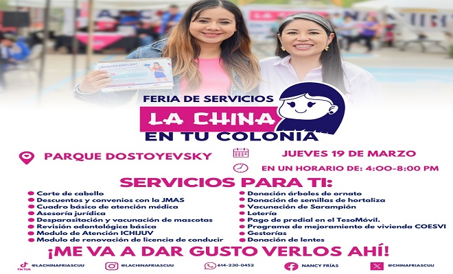 Ciudad de Chihuahua.- La diputada “La China” Frías anunció la realización de la Feria de Servicios en tu Colonia, que se llevará a cabo este jueves 19 de marzo en el Parque Dostoyevsky, en un horario de 4:00 a 8:00 de la tarde.